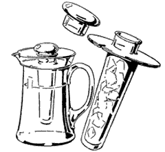 Wine serving basicsThe wine owner needs a few tools and gadgets for his greater comfort and better security of his treasure. First of all a decent corkscrew. The narrow gimlet corkscrew (left on the image below), though suitable for the smaller beer cork, is not safe to use for wine. It may easily pull away, bringing the core of a perished cork with it. ![]() The corkscrew on the right, drawn to the same scale as the one on the left, is to be recommended. The section of the screw is flattened and edged, thus giving a better bite on the cork. N.B. The brush should be used to brush away fragments of dust, wax, or cork after carefully removing the sealing-wax, but before drawing the cork. After the cork is drawn, the brush is more apt to push the particles into the bottle than to remove them. In the case of an obstinate cork nothing is better than the double-lever extractor: ![]() but care must be taken at the beginning of the stroke to see that the cork is coming and that the screw is not merely pulling through. The tongs (see image below) should be at hand to save the wine if any such accident should happen to the cork. They are heated to a cherry-red; the neck is gripped just under the flange-when the glow has passed away (from half-a-minute to a minute). ![]() Remove the tongs, and, dipping a feather or piece of rag into cold water, apply it to the neck where the tongs have held it. It will come off easily and cleanly. The Crown cork-opener (see below), for aerated water-bottles, is now an indispensable accessory for the cellar. ![]() Hand-guards. When drawing a cork a guard should always be used. A cloth at least, or a leather guard which is slipped over the neck (see below). One can never be sure there is not a flaw in the bottle, and a dangerous cut to hand or thigh is not worth risking. ![]() There exists a device with elevating gear like a turret-gun (but something smaller) for steady pouring of a fine old crusted Port. This seems to me overdoing it a little. Still, to do justice to a really old wine, 'twere best if the host and anyway, this is an impressive piece of 'business,' as they say in the theatrego down to his cellar and bring up the treasure in his own hands. No deputizing can be adequate. The basket (see below), except in restaurants where the bottle and cork are produced as evidence of good faith, also seems to me something of a superstition. There is obviously, except with the most tender handling, apt to be ![]() a `back swish' as the basket is set down. Better decant at once and eliminate the basket; or (in the restaurant) decant from the basket and dismiss it with its bottle, and enjoy the pleasure of the look of a fine wine in the decanter The eye helps the palate in all drinking of good wine. I cannot quite agree with Dr. Mathieu's case against decanting, though distressed to find myself with, I imagine, most of my fellow wine merchants in opposition to such an authority. Dr. Mathieu asserts quite truly that the wine in process of being decanted takes up oxygen, which changes the taste and perfume of the wine. Agreed. But the wine, anyway, must reach the oxygen before being drunk, unless we are to drink it at one draught from the bottle; and there is surely more likelihood of the back swish of the bottle, whether poured from basket or hand, disturbing the sediment than really careful decanting. But the connoisseur-scientist's somewhat ecstatic description of how wine should be served and drunk seems to me so valuable that I add it as a footnote to this chapter. ![]() The decanting funnel (see above) is recommended for decanting good wine. It should always be perfectly clean boiled, in fact, before use and should be warmed to the temperature of the wine which is being decanted. The turned end of the funnel directs the wine down the side of the decanter and prevents 'frothing.' ![]() The little hard wood `swizzler' (see above) is much in vogue with folk who do not care for highly-aerated waters or extra fizzy drinks. If 'sizzled' round in a glass of champagne it effectually releases the gases and reduces the effervescence. For 'cups,' a double glass vessel (see below) is indispensable. The inner container holds the ice and is removed just before serving. The ice should not be put directly in the wine, because it may not always be perfectly clean, and because it dilutes and often 'clouds' the wine. ![]() Decanting should always be done carefully. All wines throw some deposit; the deposit, in a sound wine, indicating improvement. This deposit is not required for consumption, and should be left in the original bottle when decanting. Its presence in the decanter spoils not only the appearance but the flavour of the wine. When decanting very old wines, such as Port, it is best, if possible, to remove the neck of the bottle below the cork with the tongs as above described. When opening Champagne, remove all wire and foil before releasing the cork. Many a bottle of good wine has been spoiled by allowing the contents to run over mouldy string and rusty wire. Do not put ice into Champagne, but only around the bottle. Wine drunk too cold loses much of its fine flavour. It is not, by the way, safe to decant two bottles of wine into the same decanter, not merely in case there should be anything wrong with one of them, but because a supreme accidental character of one specially-favoured bottle may well be lost. Respect each bottle of your fine wine as having temperament, individuality. Having your good wine to decant, into what sort of vessel are you to decant it ? In general terms one answers: Into a vessel which shall show off to best advantage the colour of the wine, which means certainly first of all into a vessel of pure white glass. Custom has decided that Port and Sherry shall be poured from solid, heavy, broad-based, or onion-bellied decanters (A). But let all other wines be decanted into caraffes of the more delicate-stemmed shape here illustrated (B and C). ![]() This 